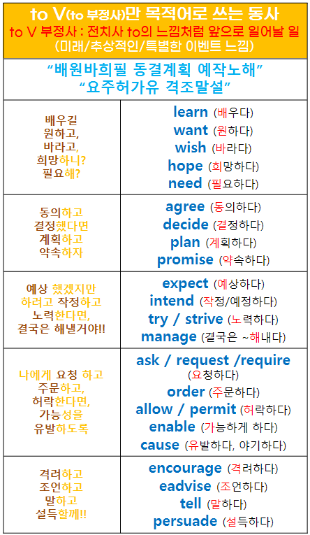 외우기 쉽게 to V(to 부정사)만 목적어로 쓰는 동사들을 의미상으로 묶어서 외우기 쉽게 만들어보았어요. 쉽게 외울 수 있길, 도움이 되길 바라요!! ^-^